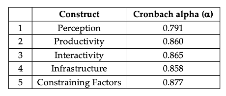 The UTAUT framework was used as a basis for assessing the validity of the instrument developed to measure the educators’ behaviour in their intention to adopt technology. We have developed items from the instrument that are directly aligned with the UTAUT constructs, and these are performance expectancy, effort expectancy, facilitating conditions, perceptions and constraining factors.