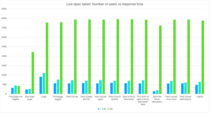 The response time of the high-spec tablet is shown in Figure 3. The performance of the high-end tablet was not as expected as the number of users was increased. One would expect the response time to increase with an increase in users. However, in some cases, the opposite occurred, for example, with regard to the login function, as seen in the graph. The researchers had two theories to explain this: first, tablets usually have a lot of applications running in the background, such as location apps, which could have been using the resources of the tablet during testing and, second, tablets usually have two modes of running, the energy-efficient mode which is usually on and does not utilise the full capacity of the tablet or the more powerful mode, which is switched on when the tablet has a larger load. Additionally, the tablet required a lot of technical tinkering to make it possible to host the LMS, which may also have led to unpredictable performance for the tablet.