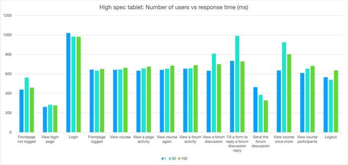 For the tablets, the high-spec tablet performed better than the low-spec tablet as expected. For all activities tested, the high-spec tablet had a response time of 1,021 milliseconds or less for one user, 992 milliseconds for 30 users and 982 milliseconds for 100 users. The low-spec tablet had the highest response time of 1,819 milliseconds or less for one user, 2,212 milliseconds or less for 30 and an increase to 7,912 milliseconds or less for 100 users. Overall, the low-spec tablet performed the worst in terms of response time.