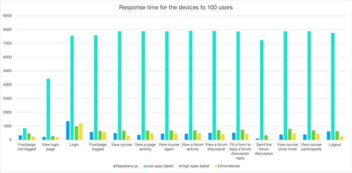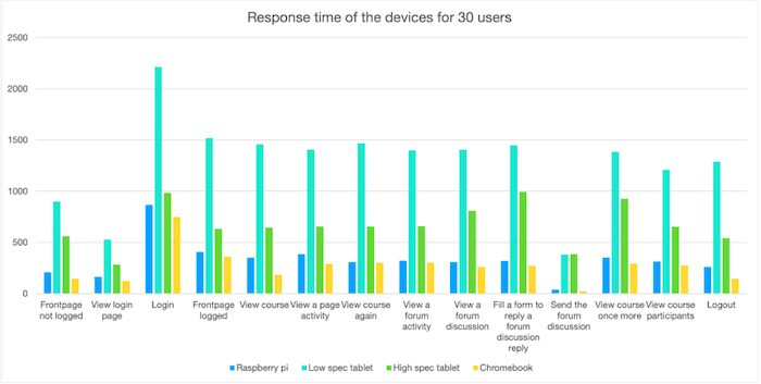 The findings above and our findings imply that theoretically, the Raspberry Pi, high-end tablets, and Chromebooks can provide access for up to 100 users with adequate performance in terms of response time and resource utilisation. Therefore, in schools with many teachers (up to 100) the Raspberry Pi, a high-spec tablet, and a Chromebook should be adequate micro-servers for the LMS. However, limitations do need to be considered.