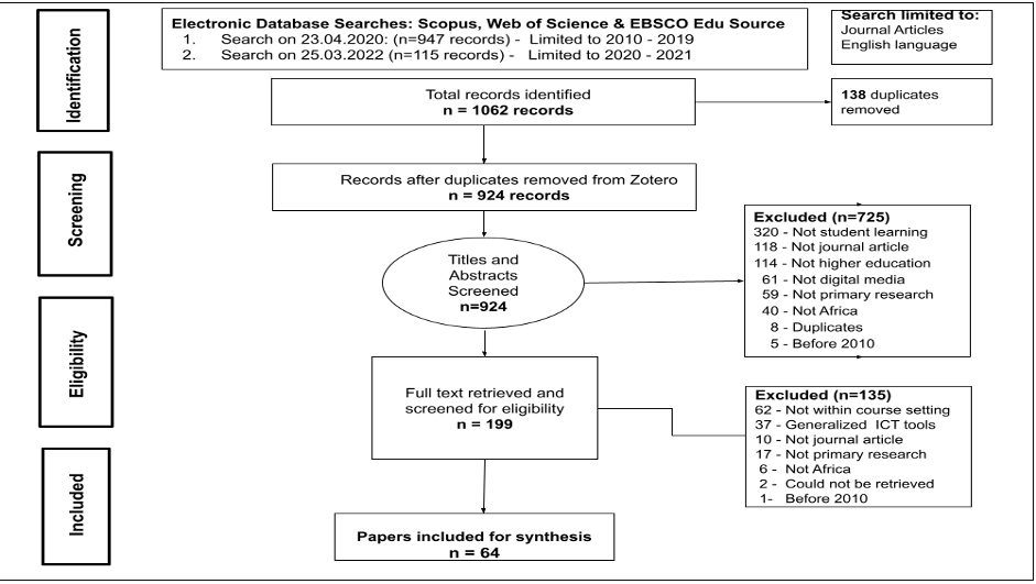 However, as Bond et al. (2020) noted, there are few educational technology systematic reviews with an explicit regional focus. Furthermore, Bartolomé et al. (2018) observed that research on digital media for student learning largely ignores the pedagogical perspectives regarding their utilisation. This gap in the literature needs to be addressed, with the goal of informing the instructional design process and media selection for improving digital education through an authentic African lens. Thus, this study uses a systematic review to explore the application of digital media for students’ learning within the African higher education context.